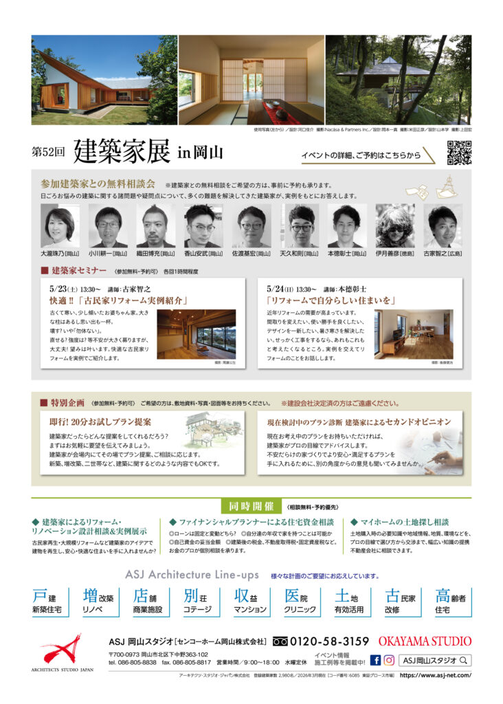 建築家による新築や改修の住宅・店舗・クリニック設計の竣工写真パネルや模型の展示。建築家や不動産会社、FPによる無料相談会、家づくりセミナーも同時開催。