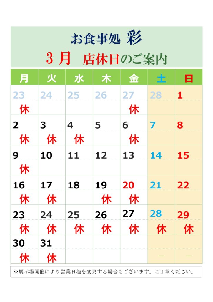 レストラン彩(いろどり)3月の店休日をご案内します。