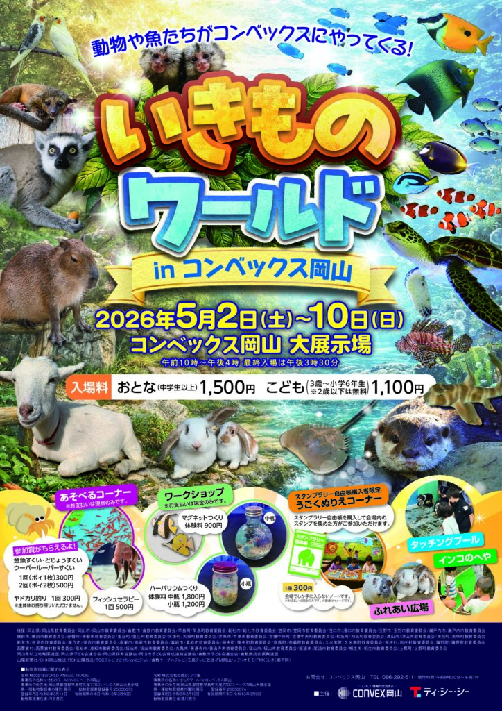 いきものワールドinコンベックス岡山 会期:2026年5月2日(土)~10日(日) 時間:午前10時~午後4時(最終入場は午後3時30分) 場所:コンベックス岡山 大展示場 料金:入場料:おとな(中学生以上)1,500円 こども(3歳~小学6年生※2歳以下は無料)1,100円